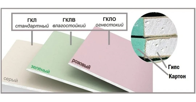 ГКЛО. Считается дорогим и огнестойким материалом. Окрашены в розовый или красный оттенок. Основное отличие сосредоточено в сердцевине, где слой гипса способен выдержать более высокий температурный режим. Вид гипсокартона покупают для помещений, где высока вероятность возгорания. Иногда ГКЛО применяют для вентиляционной системы.