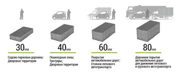 65-100 мм — для мощения серьёзно нагруженных зон, в частности, с постоянным траффиком, включая грузовую и специальную технику.